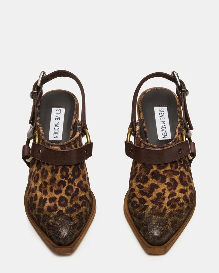 The Talika Leopard Suede Heel Delivers Refined Elegance with Its Sharp Pointed-Toe Profile and Secure Slingback Strap Anchored by a Polished Buckle Closure. The Sturdy Block Heel Ensures Comfortable Wear Throughout the Day While Maintaining a Sophisticated Silhouette. An Expertly Crafted Shoe That Balances Style and Wearability.
