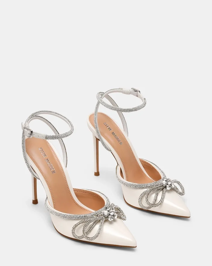You’ll Be the Bell of the Ball in Viable, the Dress Heel You’ll Wear for Years to Come. Set Atop a Slender Stiletto Heel, This Pointed-Toe Pair Features a Slim Rhinestone-Embellished Ankle Strap and Bow Design.