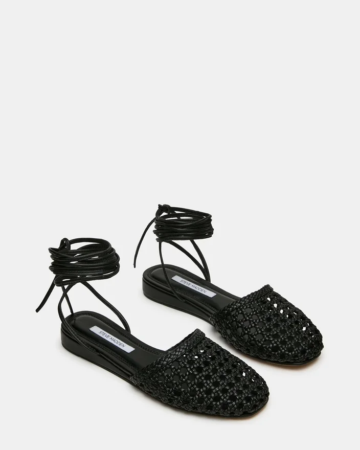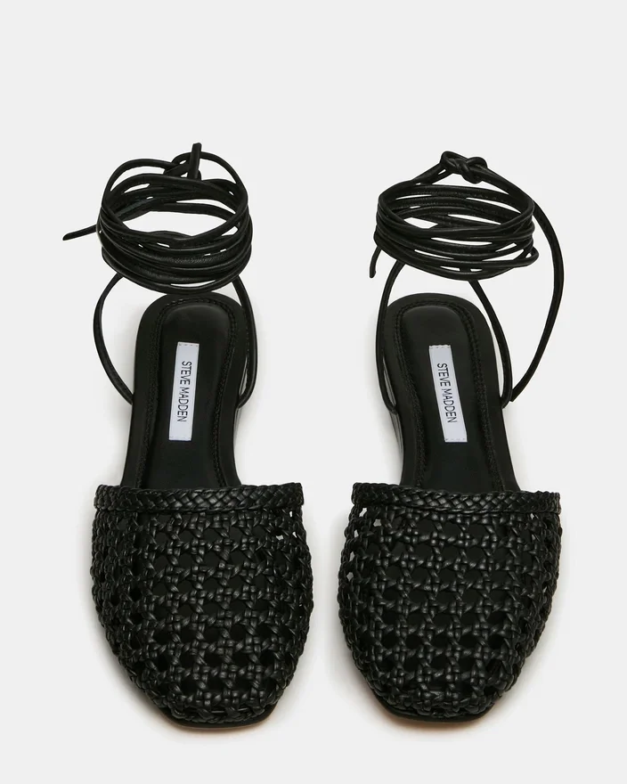 The Flutter Black Leather Flat Showcases Understated Sophistication Through Its Unique Design. The Woven Construction Provides Visual Interest and Breathability. The Signature Leg Ties—a Defining Feature—Create an Architectural Silhouette. Designed for Versatility, It Transitions Seamlessly from Relaxed Daytime Wear to Refined Evening Occasions.