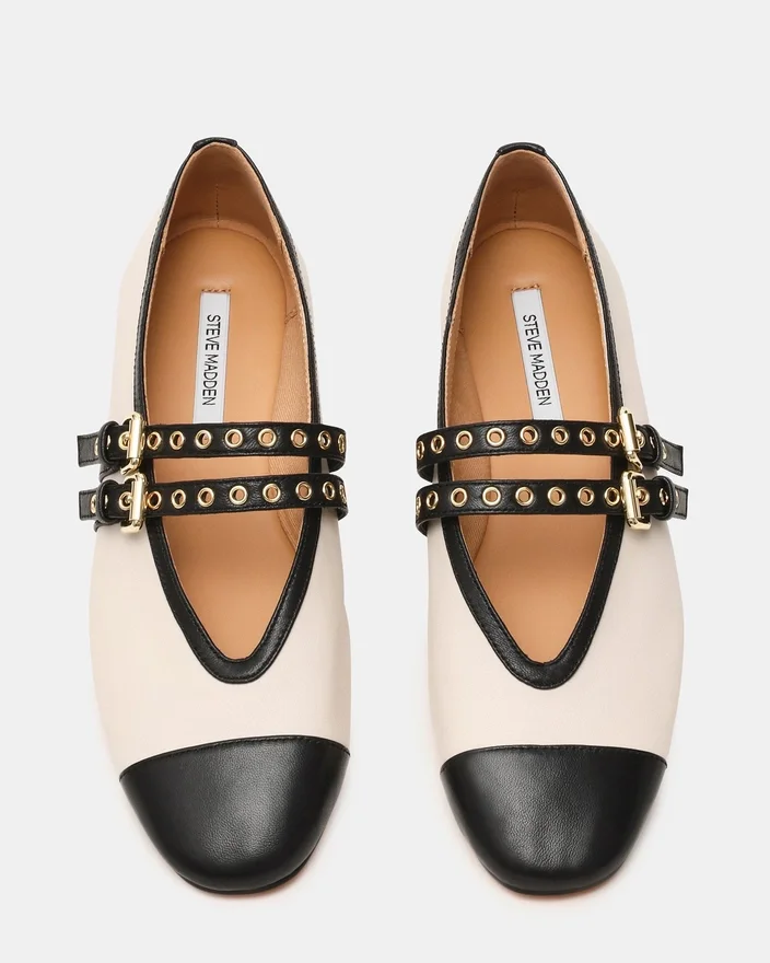 The Lydia Cap Bone Black Mary Jane Ballet Flat Combines Classic Elegance with Modern Detailing. Crafted from Quality Materials, It Features a Secure Buckle Strap That Ensures a Comfortable Fit While Adding a Refined Touch. Its Sleek Silhouette and Durable Sole Make It Ideal for Both Professional Settings and Casual Wear, Offering Versatility Without Compromising on Style or Support.