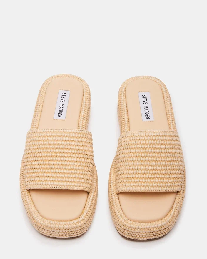 The Beachy Square Toe Sandal Secured a Woven Raffia Wrapped Flatform Sole with a Matching Wide Slide Strap for a Super Comfy Textured Look.