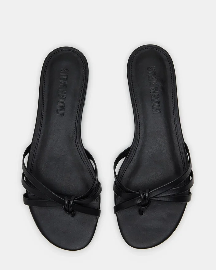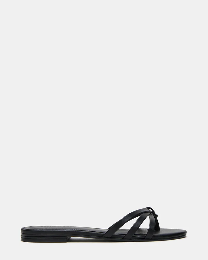 Crafted with Luxurious Materials, the Calissi Black Leather Sandal Features a Sleek Strappy Design and a Comfortable Flat Sole. Perfect for Any Occasion, These Slide Sandals Effortlessly Elevate Your Outfit While Providing All-Day Comfort.