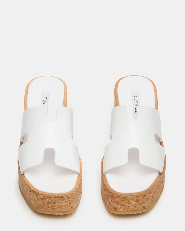 The Harmony White Leather Wedge Sandal Features a Cork Platform That Delivers Both Style and Comfort for All-Day Wear. The Structured Wedge Heel Provides Stable Support Without Sacrificing Elegance. A Versatile Choice for Transitioning from Casual Outings to Elevated Occasions.