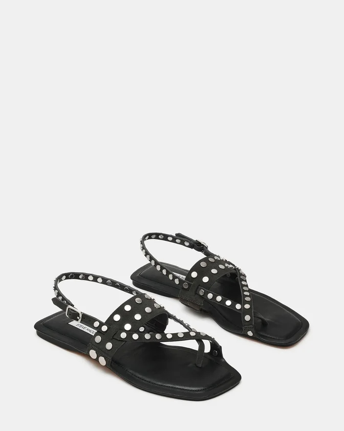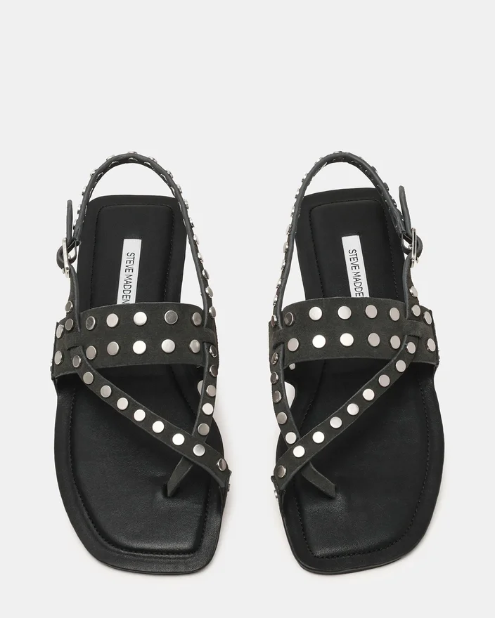 The Kaeli Dark Grey Suede Combines Understated Elegance with Bold Design Details. This Toe-Strap Design Features a Striking Square-Toe Silhouette That Offers a Modern, Architectural Look. Dome Studs Add an Edgy Touch. Perfect for Elevating Casual Outfits, This Sandal Delivers Versatile Style with Personality.