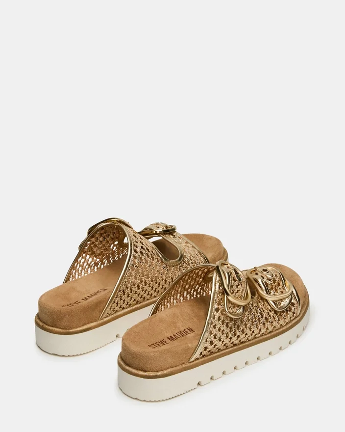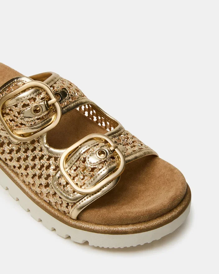 The Shellby Gold is an Expertly Crafted Woven Sandal Designed for Effortless Comfort and Style. The Slide Silhouette Features Secure Buckle Closures That Provide Adjustable Fit and Stability Throughout the Day. A Contoured Footbed Offers Arch Support and Cushioning, Making This Versatile Piece Ideal for Both Casual Outings and Relaxed Occasions. The Woven Construction Delivers Breathable Wear Perfect for Warm Weather.