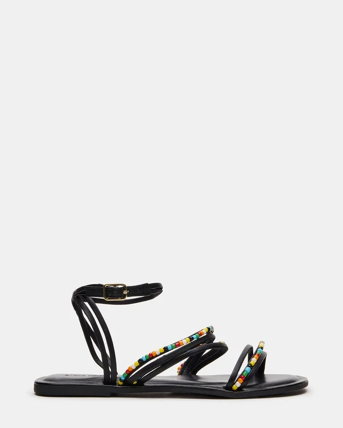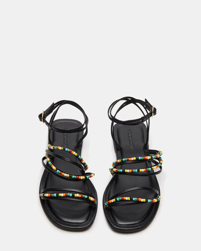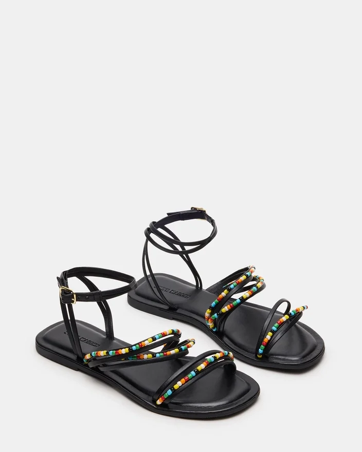 Elevate Your Look with the Vima Black Multi Strappy Sandal, Featuring a Chic Square Toe and an Adjustable Ankle Strap for a Secure Fit. Beautifully Adorned with Multi-Colored Beads, This Sandal Adds a Refined Touch of Artistry and Color to Any Outfit, Balancing Sophistication with Playful Elegance. Perfect for Both Casual and Dressy Occasions, Its Design Ensures Comfort Without Compromising Style.