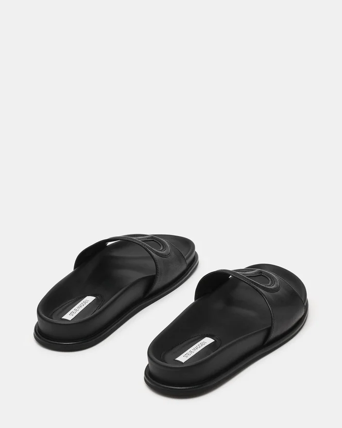 The Zosia Black Leather Sandal Combines Effortless Style with Thoughtful Construction. This Slide Features a Striking Cutout Design That Adds Visual Interest While Maintaining a Sleek Silhouette. The Footbed Provides All-Day Comfort, Making It Equally Suited for Casual Outings or Relaxed Evenings at Home.