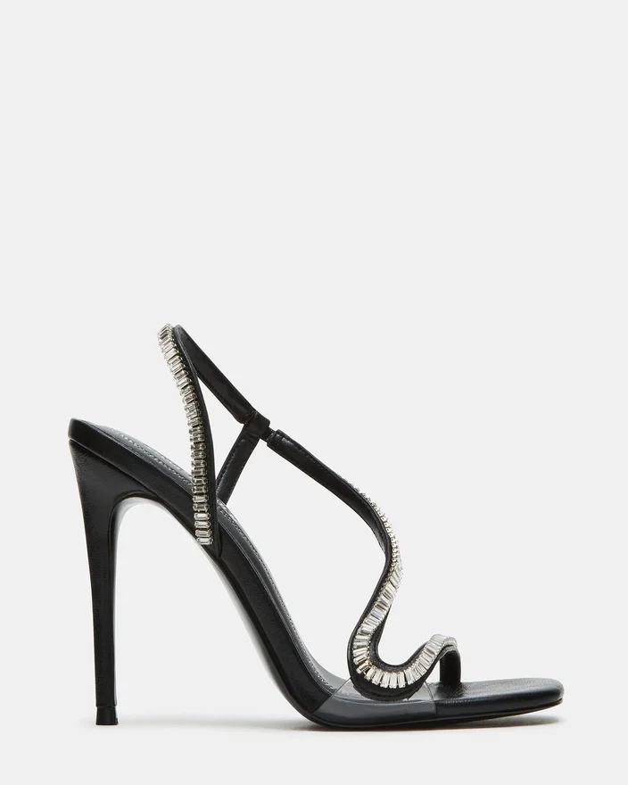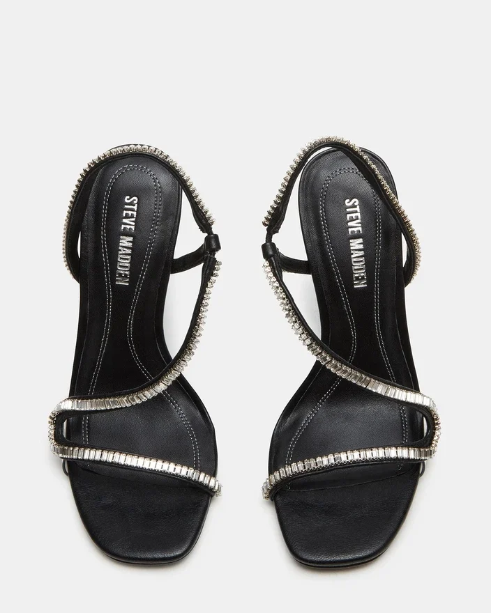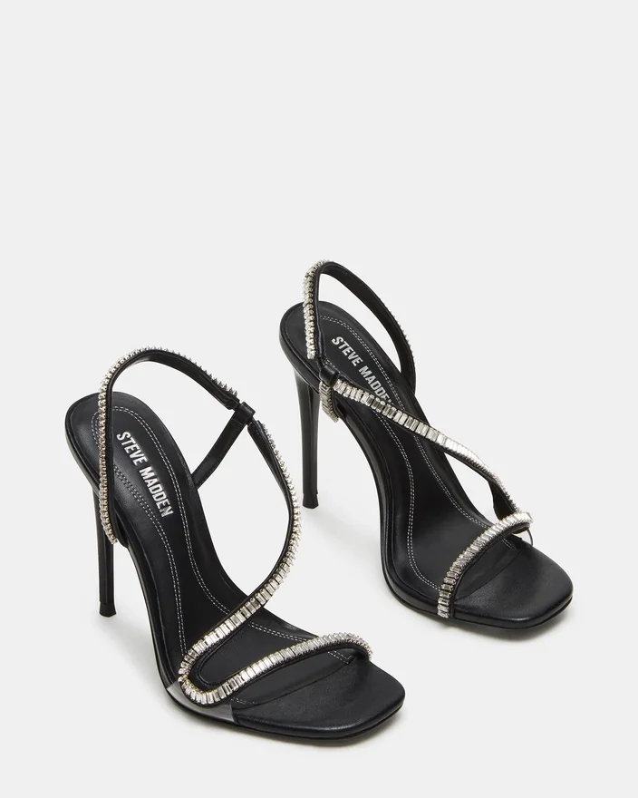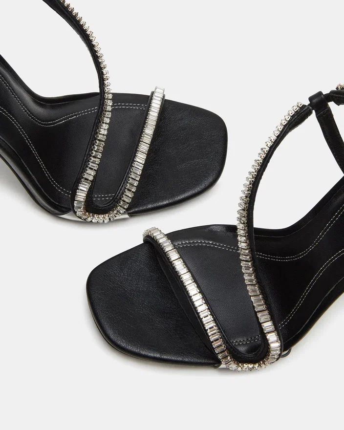 Expertly Designed with a Rhinestone Stiletto Heel and a Unique Embellished Strappy Design, the Nessa Shoes Combine Fashion and Function. The Square Toe Provides Added Comfort and Style, Making These Shoes Perfect for Any Occasion. Elevate Your Look with These Eye-Catching Heels.
