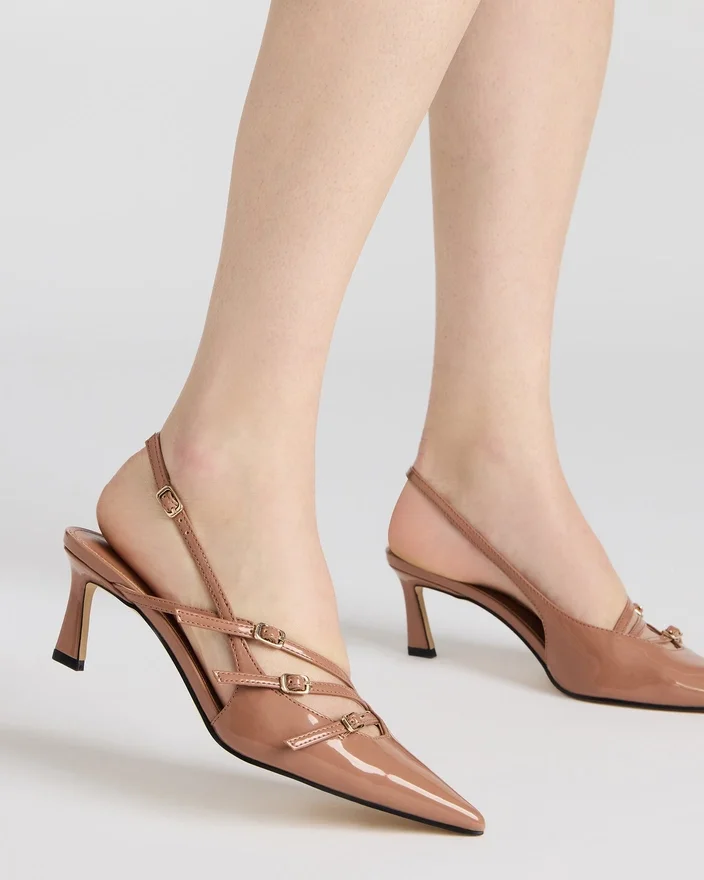 Indulge in Luxury with the Liana Slingback. With Its Low Heel and Pointed-Toe, This Shoe Exudes Elegance. The Strappy Front Design Adds a Touch of Sophistication, While the Patent Material Elevates the Overall Look.