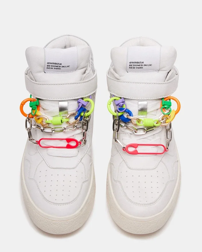 The Emilee Sneakers Feature a Padded Collar and Flatform Sole for a Substantial, Structured Silhouette. A Selection of Cheerfully Mismatched Charms and Chains Accent the Laces for a Pop of Color.