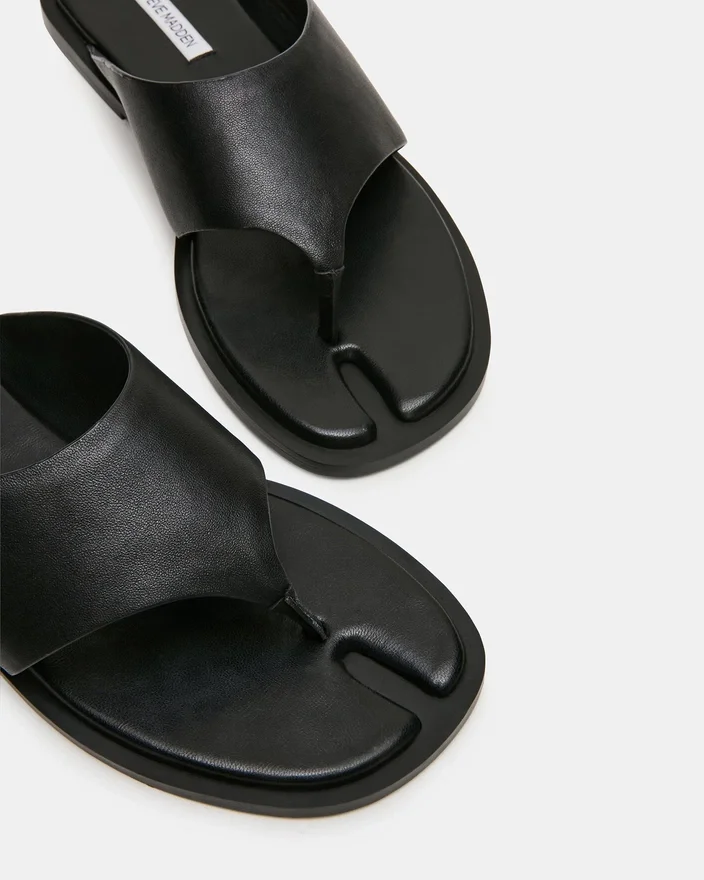 The Illia Black Leather Reimagines the Classic Tabi Sandal with a Contemporary Twist. Featuring a Thick, Architectural Strap That Delivers Both Support and Style, This Thong Sandal Channels Minimalist Design with Maximum Impact. The Distinctive Silhouette Offers a Modern Edge While Maintaining Everyday Wearability, Making It an Ideal Choice for Those Who Appreciate Bold, Statement-Making Footwear.