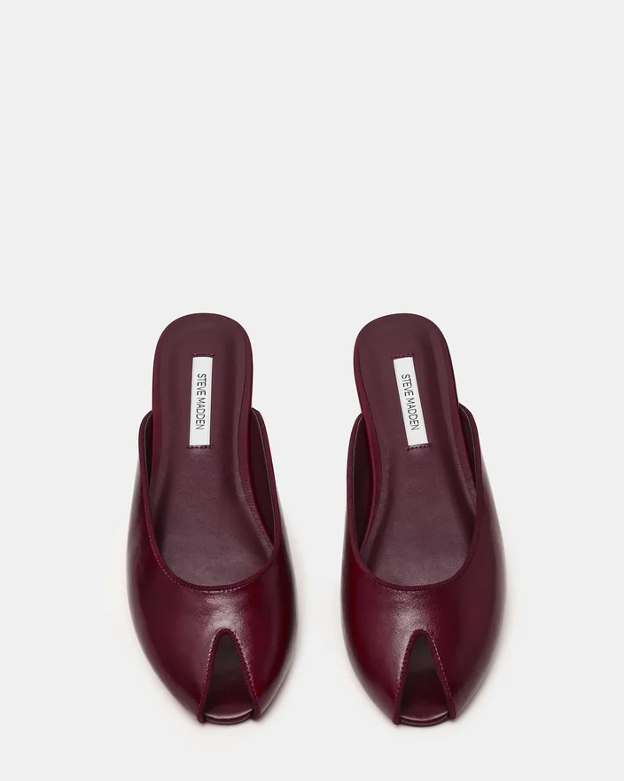 The Bloss Burgundy Leather Combines Effortless Style with Everyday Wearability. This Peep-Toe Mule Features a Slip-On Design That Transitions Seamlessly from Office to Evening, While the Flat Sole Ensures All-Day Comfort. Crafted with Premium Materials, It’s a Versatile Essential That Pairs with Virtually Any Wardrobe. The Open Back and Exposed Toe Create a Modern Silhouette That Feels Both Polished and Relaxed.