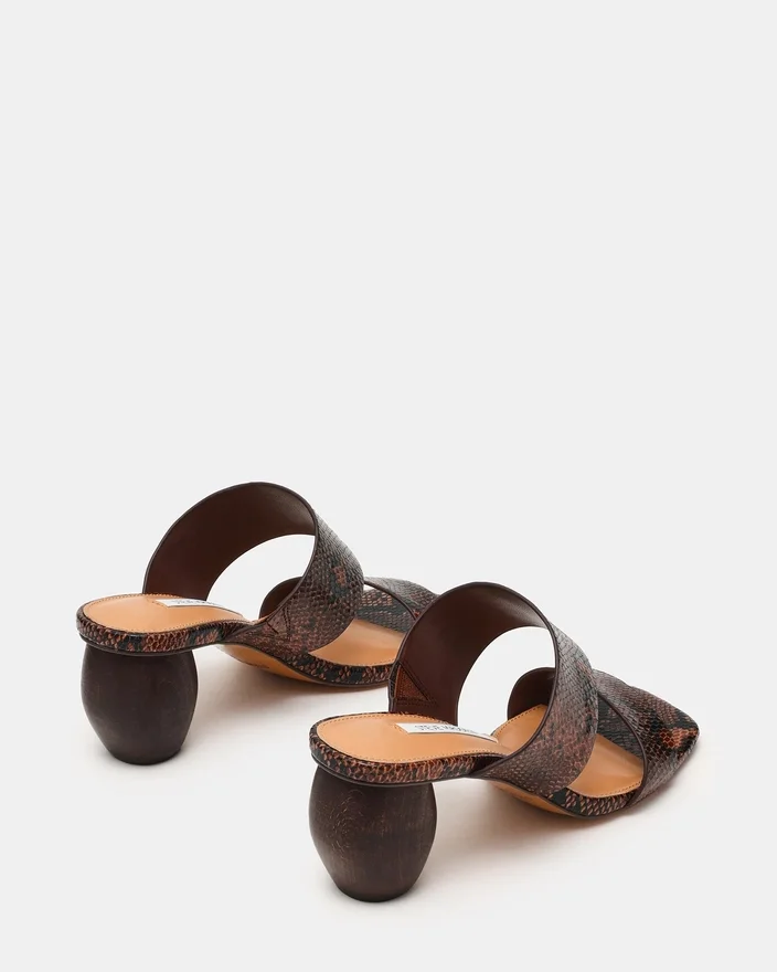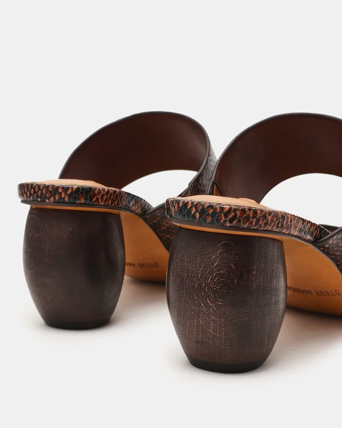 Step into Effortless Style with the Nola Brown Snake. This Modern Mule Features a Distinctive Square Toe and Sturdy Block Heel for All-Day Comfort and Stability. Thick, Supportive Straps Keep Your Foot Secure While Delivering a Bold, Contemporary Look. Perfect for Transitioning from Day to Night with Minimal Effort.