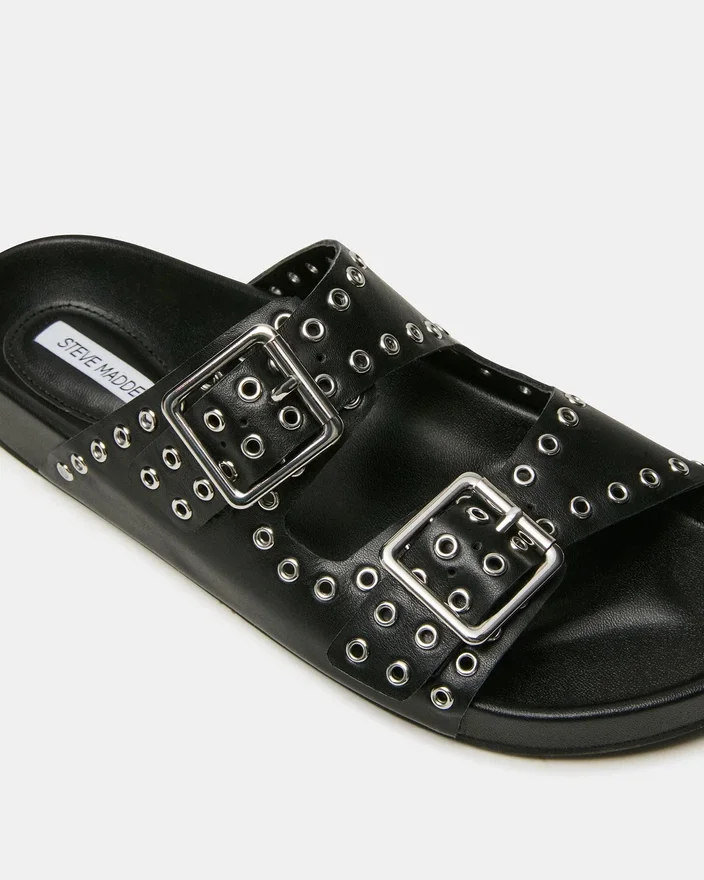 The Abott Black Leather Slide Sandal Combines Understated Elegance with Practical Comfort. Intricate Grommet Detailing Adorns the Upper, While Dual Buckles Ensure a Customizable, Secure Fit. The Supportive Footbed is Engineered for Extended Wear, Making This a Sophisticated Choice for Those Who Demand Both Style and Functionality in Their Everyday Footwear.