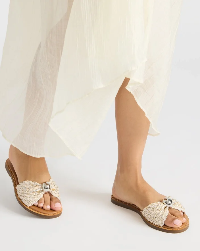 This Dipsy Slide Sandal Features Mini Studs and a Rounded Toe for Added Style and Comfort. The Perfect Combination of Fashion and Practicality, These Sandals Are a Must-Have for Any Wardrobe. With Their Natural Raffia Design, They Add a Touch of Rustic Charm to Any Outfit.