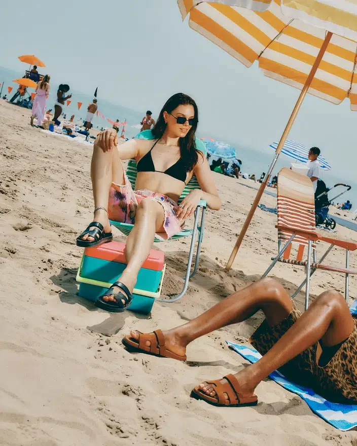 The Leather Mayven Slides Feature Comfy Construction Details Like a Molded Footbed, a Treaded Flatform Sole, and an Adjustable Top Strap, Plus a Front Strap with a Geometric Cutout Design.